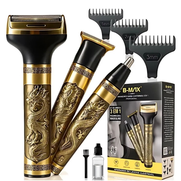 Kit aparador masculino profissional 3 em 1 com design exclusivo dourado dragão. Ideal para cortes precisos, contornos detalhados e remoção de pelos do nariz, este conjunto combina alta performance com sofisticação para homens exigentes. Possui motor potente e silencioso (<60dB), sistema inteligente anti-pulxões e lâminas de titânio ultra afiadas para um acabamento impecável sem desconforto.